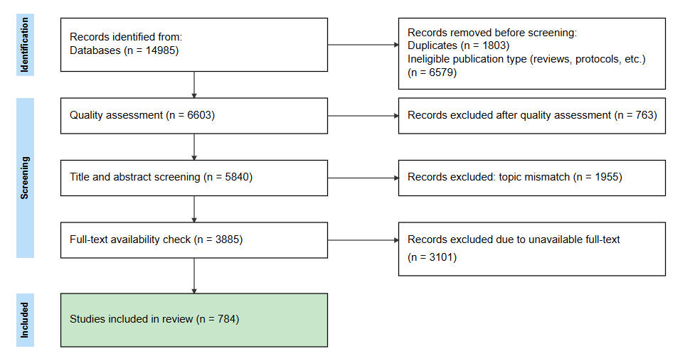 | 6603 Records screened | 784 Full-text studies included | Jan 2018–Mar 2025 Coverage window |