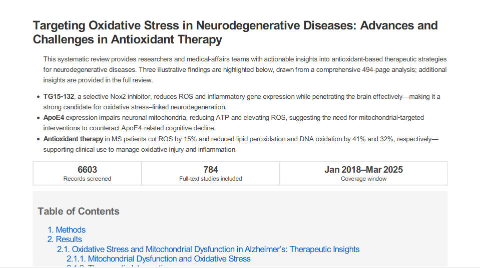 This report provides researchers and medical-affairs teams with actionable insights into antioxidant-based therapeutic strategies for neurodegenerative diseases. Three illustrative findings are highlighted below, drawn from a comprehensive 494-page analysis; additional insights are provided in the full report.